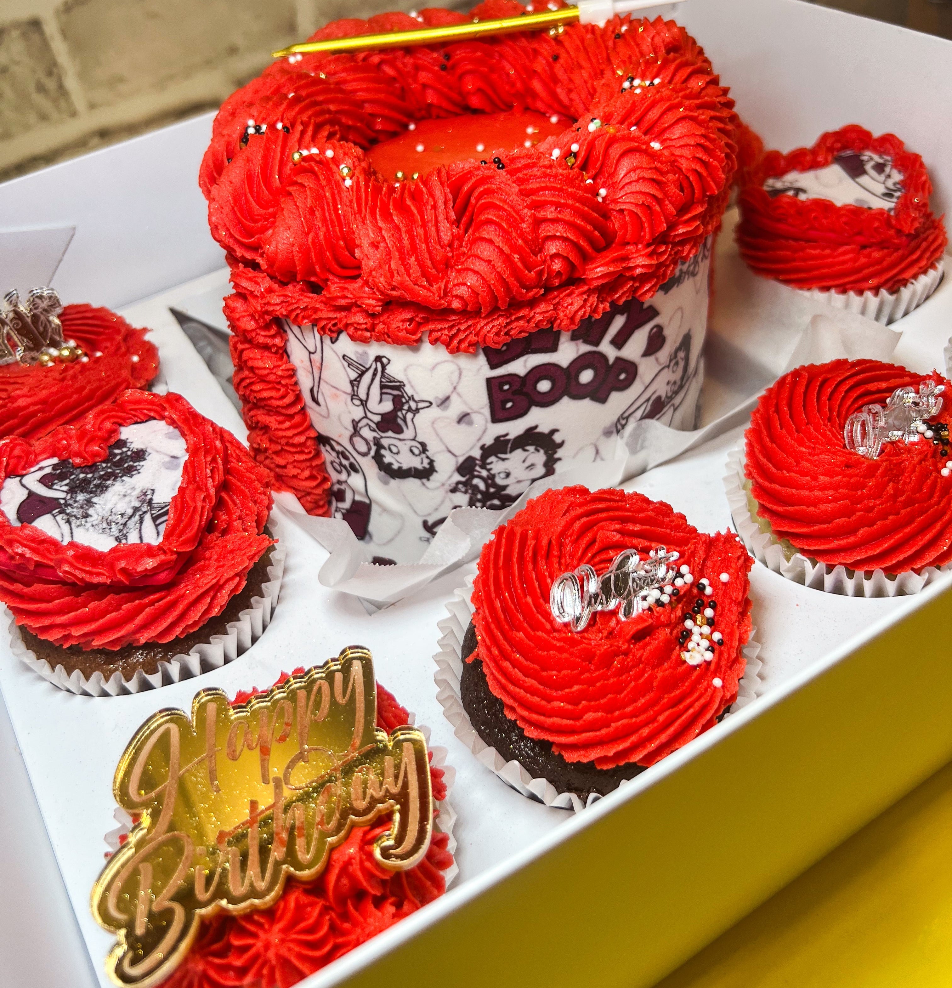 - Mini Lux: 4” cake + 5 cupcakes (feeds up to 11) ($85)